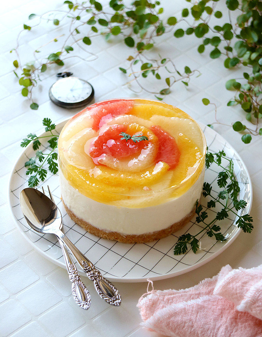 グレープフルーツレアチーズケーキの作り方 爽やかグレープフルーツゼリーたっぷり!簡単だけど絶品なレアチーズケーキのレシピ No-BakeGrapefruit Cheesecake 他の柑橘でも。