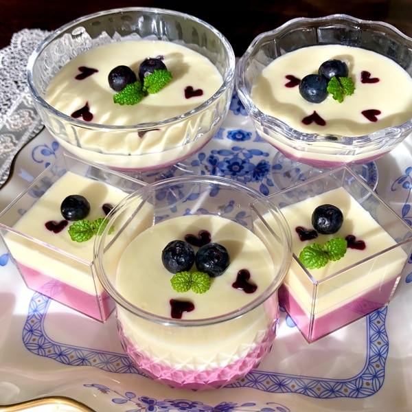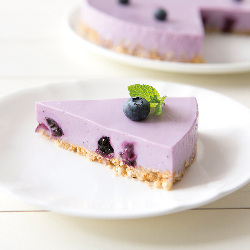 ブルーベリーのレアチーズケーキを作りました。 ブルーベリーをコンポートしてブレンダーにかけて濾し、そのシロップをレアチーズの半分に混ぜて2層にしました。1番上は残ったシロップにゼラチンを入れて流し入れ濃い紫のゼリーに。 美味しく出来上がりました。