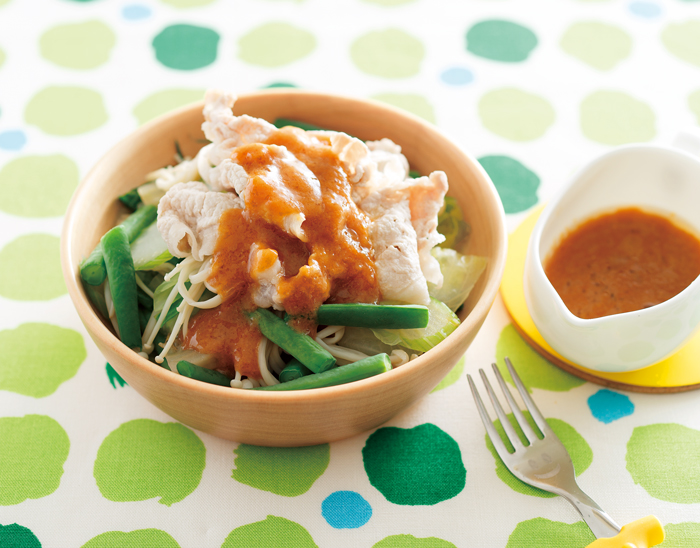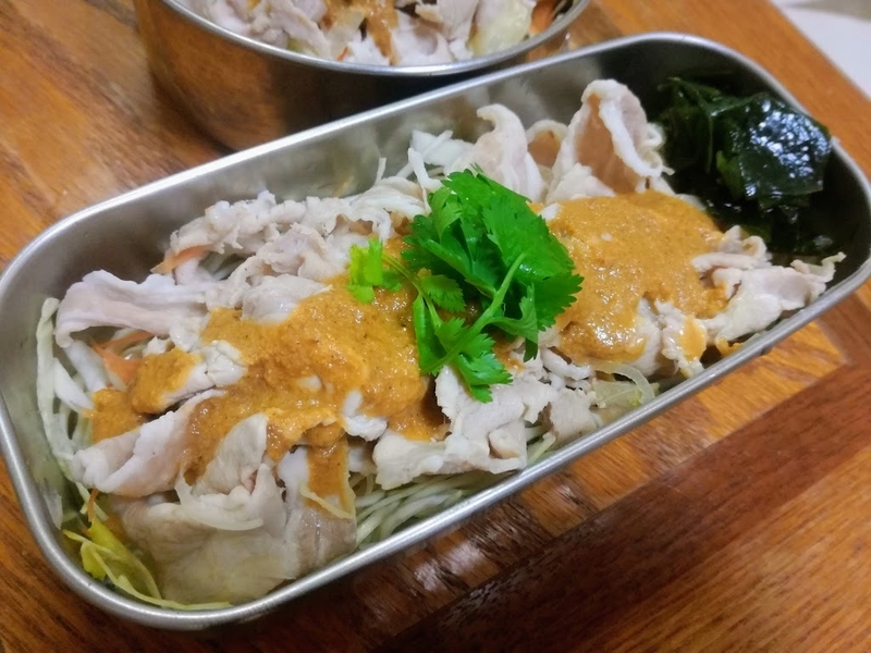 豚しゃぶお弁当レシピ:手作りごまドレで和えたしゃぶしゃぶ用薄切り肉。