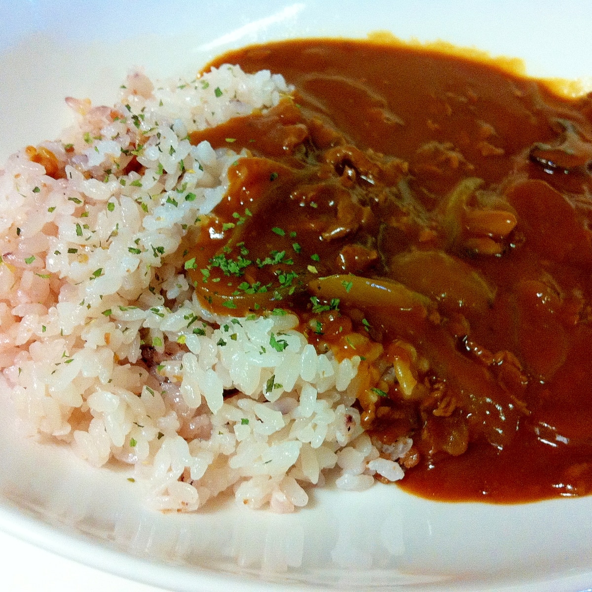 くるみハウス「完熟トマトのハヤシライスソース ボロネーゼハヤシ」のリメイクご飯 ひき肉と玉ねぎでフライパンで簡単にできるハヤシライスソースですトマト感、ハーブ感たっぷり ちょっと大人味のハヤシライスです 4皿分まとめて作って 1皿分で 雨の日の1人ご飯です。