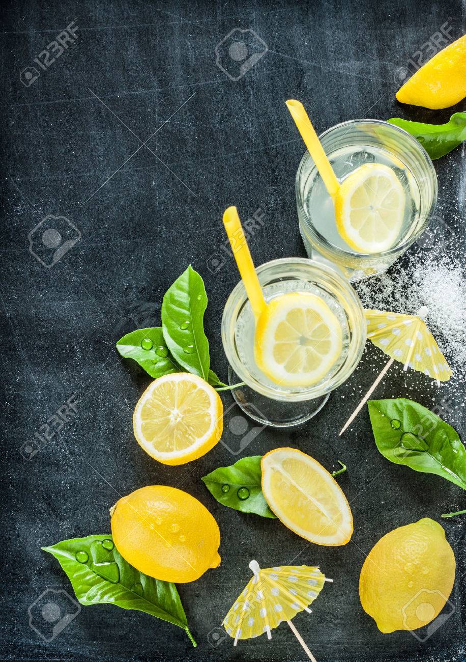 上から黒い黒板にレモンと新鮮なウェット レモネードを残します。フリー テキスト スペースの背景のレイアウト。の写真素材・画像素材 Image55317470。