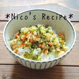 ちくわと青菜のふりかけ ① ちくわ 2本 を縦に細長く切り、みじん切りにする ② カブの茎 1株分 も同じサイズに細かく刻む ③マヨネーズ 適量 をフライパンで熱し、ちくわとカブの茎を炒める ④ 火が通ったらしょう油 適量 焦がしながら混ぜる ⑤ 海苔 1枚 を。