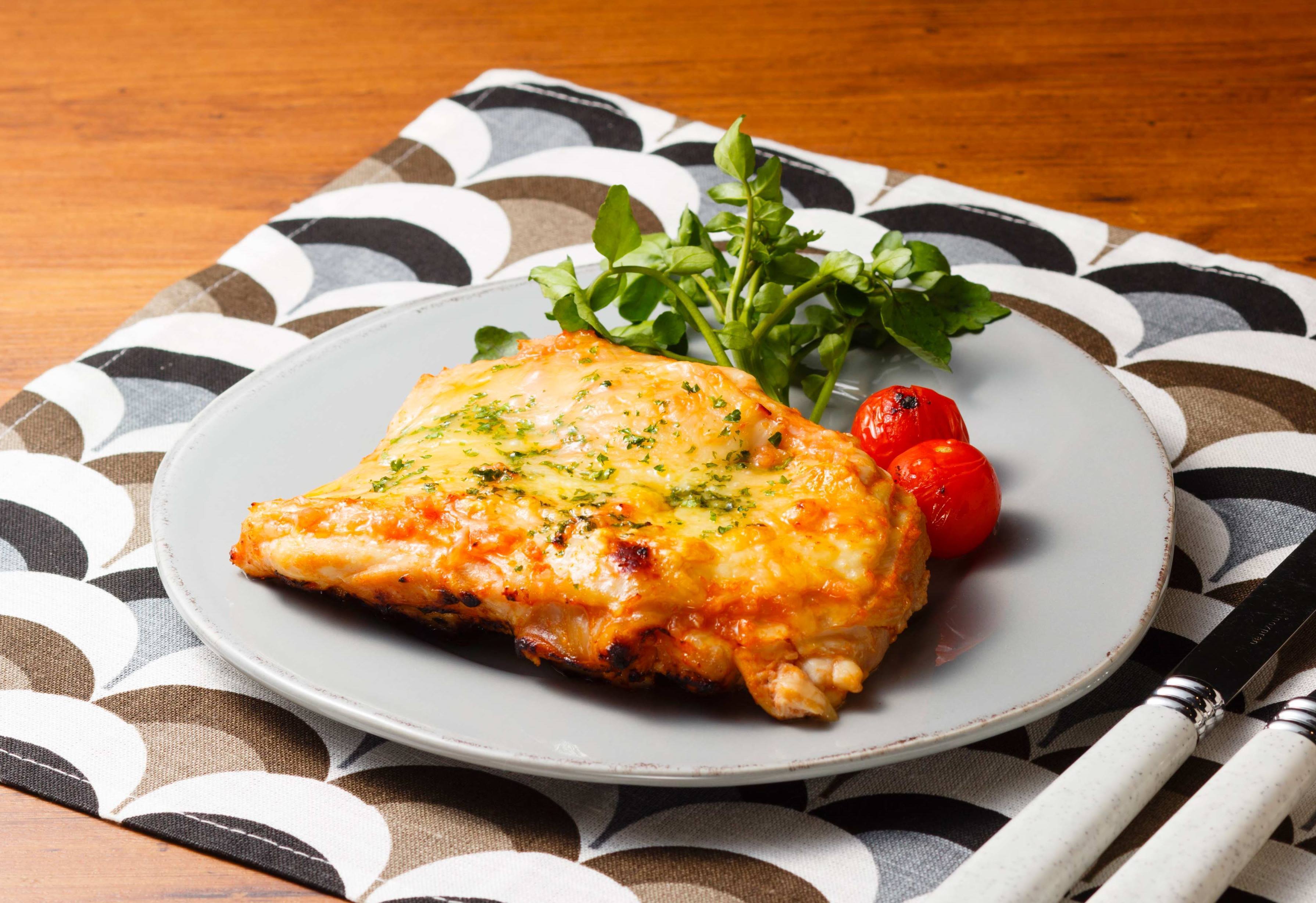 鶏むね肉のバジルチーズ焼き オリジナル: 世界の料理ショー とレシピ。