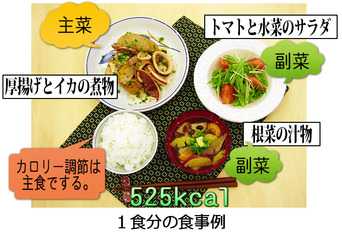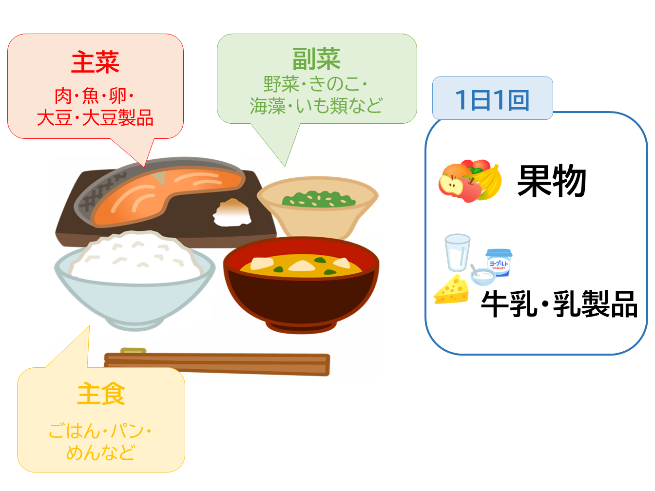主食・主菜・副菜を揃えてバランスのよい食事を山梨県厚生連健康管理センタ。