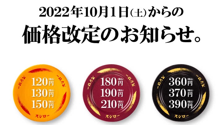 スシロー2022年10月値上げへ、新価格は「黄皿120円」「赤皿180円」「黒皿360円」食品産業新聞社ニュースWEB。