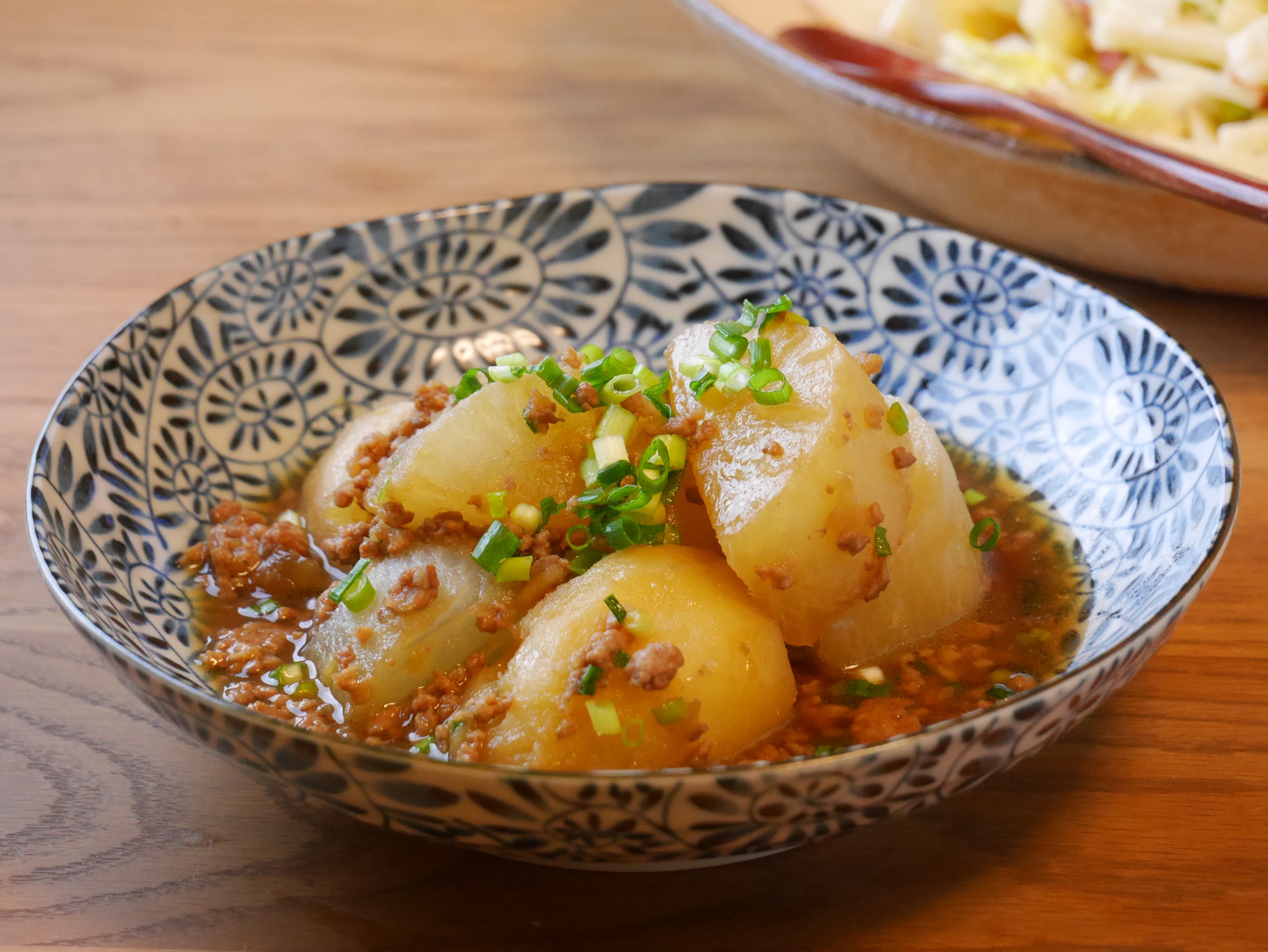 ひき肉の旨味!大根とじゃがいもの煮物の作り方よなよな食堂〜毎日の簡単料理レシピ。