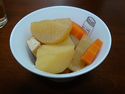 大根と人参とじゃがいもとたまねぎと鶏つくねの煮物。
