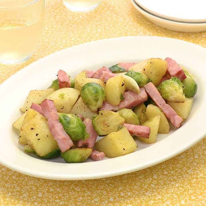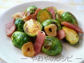 芽キャベツとベーコンのガーリックソテー やおやのレシピ。