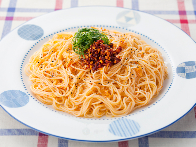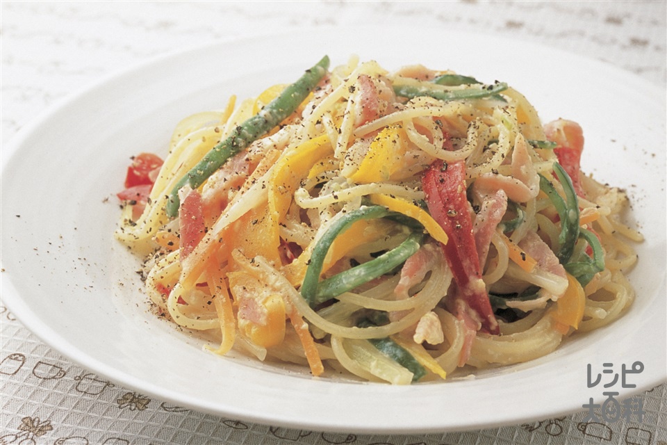 洋風!カルボナーラ風そうめんの献立 副菜:キャベツのレンジあえ、汁物:かぼちゃととうがん・豆腐のコンソメおかず スープ 献立・メニュー 味の素パーク たべる楽しさを、もっと。