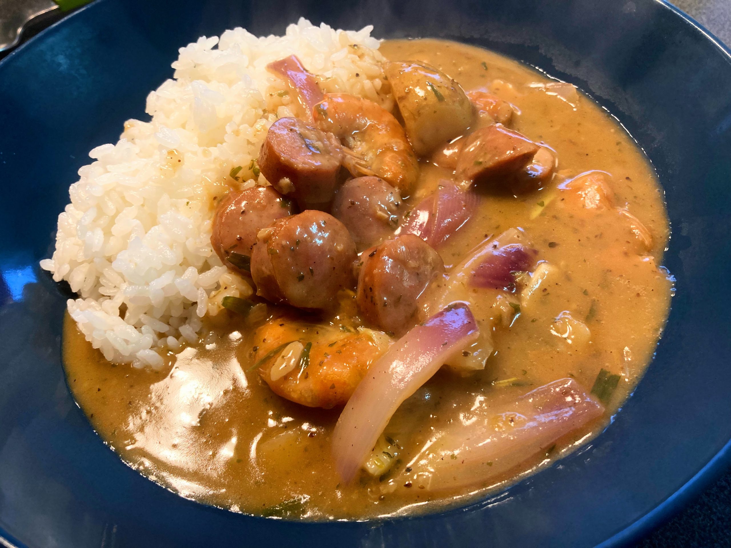 アメリカの家庭料理ルイジアナ州の料理エビとアンドゥイユ グレービーソースShrimp And Andouille Gravy豚肉の燻製ソーセージを使った料理 - YouTube。