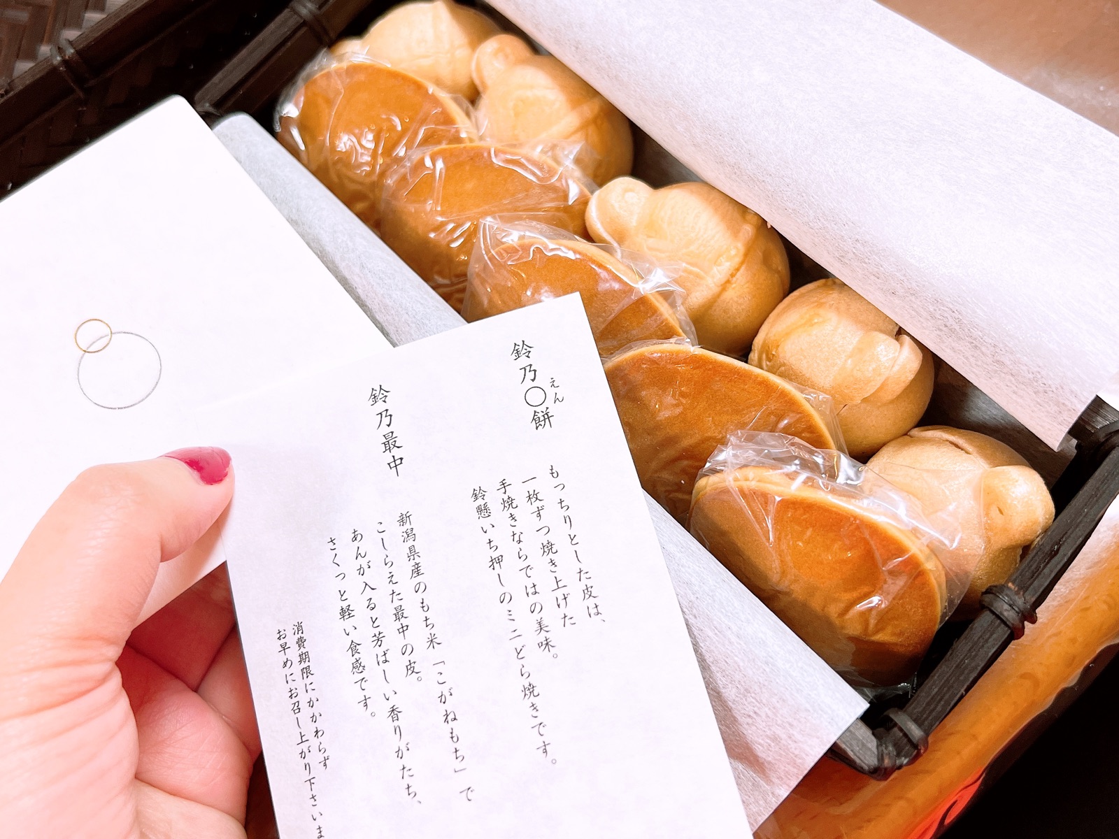鈴懸◯すず籠 このミニどら焼きと鈴型のもなかが人気商品。 もっちりとした生地にあっさり粒あんの◯餅 えんもち 。鈴型の最中種の中には粒がちゃんと残った粒あんがいい。 どちらもひとくちサイズで小さく手軽さがある。 福岡発のちょっと気の利いた手土産なら。