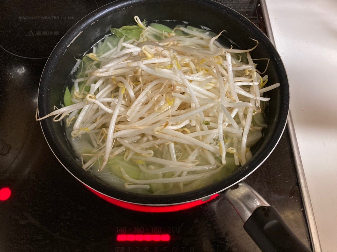 キムチ鍋汁 もやし、キャベツ投入 - YouTube。