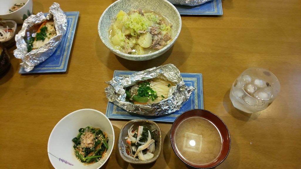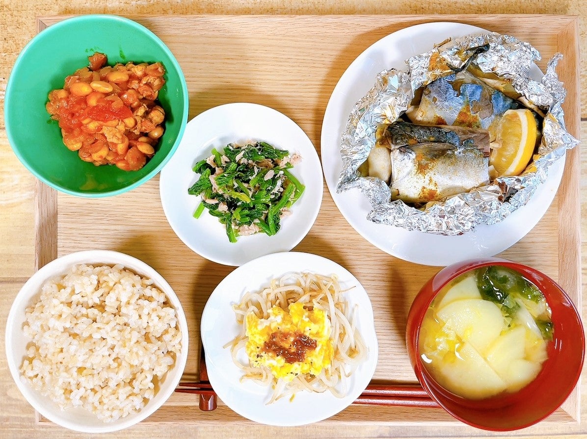 🍳 鮭のホイル焼きバター醤油味水菜のお浸し 肉じゃが 納豆卵焼き 白菜と白ネギの味噌汁 雑穀米夜ご飯 自炊 自炊生活 料理記録 ごはん記録 献立 魚料理 鮭料理 鮭のホイル焼き 肉じゃが 納豆卵焼き 雑穀米 アラスカシーフードアンバサダー募集。