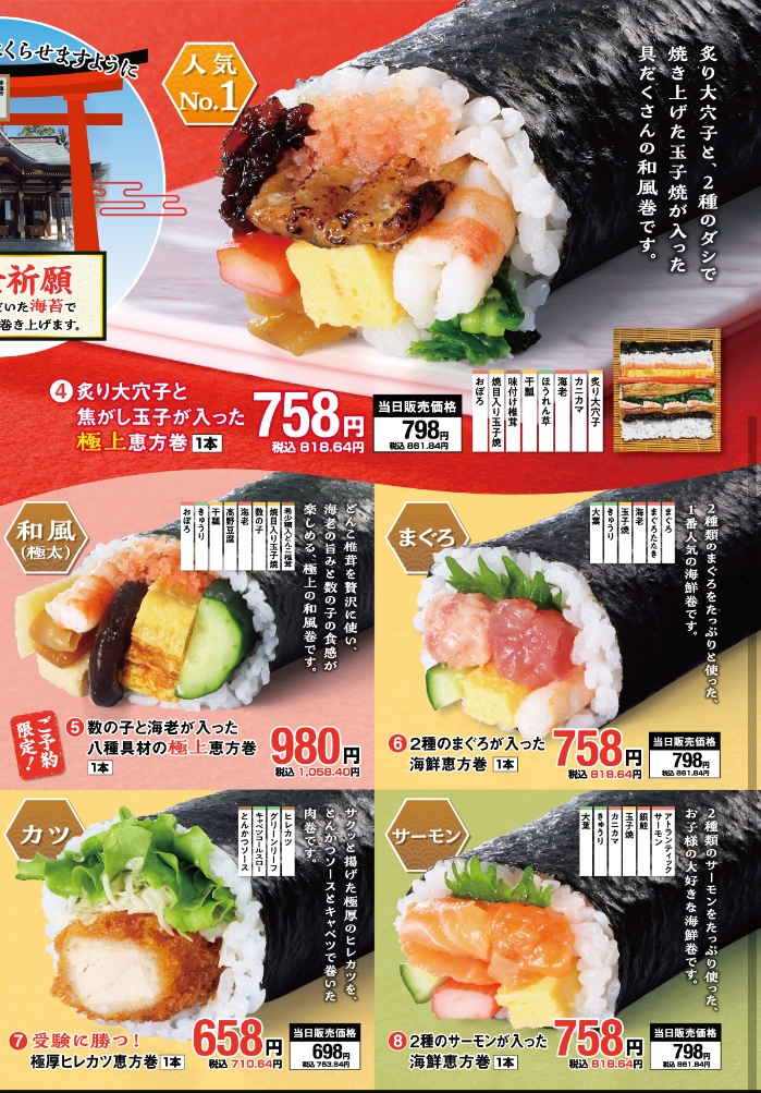 2月3日 土 節分👹 恵方巻きの予約注文を承ります。 ① 恵方巻き 太巻 ハーフサイズ ② サラダ巻き ハーフサイズ ③ エビフライ巻き ④ 海鮮巻きハーフサイズ ⑤ サーモン巻き ハーフサイズ ⑥ マグロ巻き ハーフサイズ です。 1つ1つ手作りですので各2本ずつで。