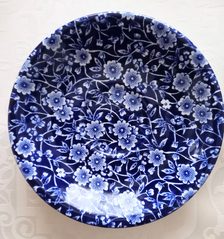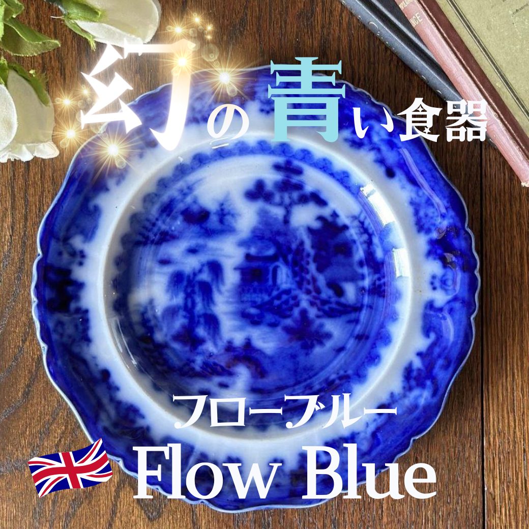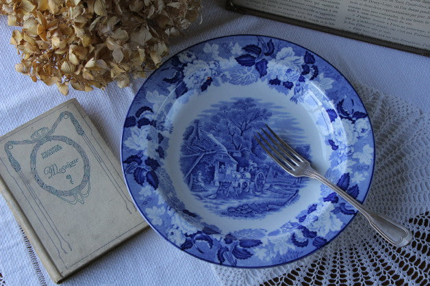 青と白のバラ模様が印象的なスープ皿イギリスアンティーク食器。
