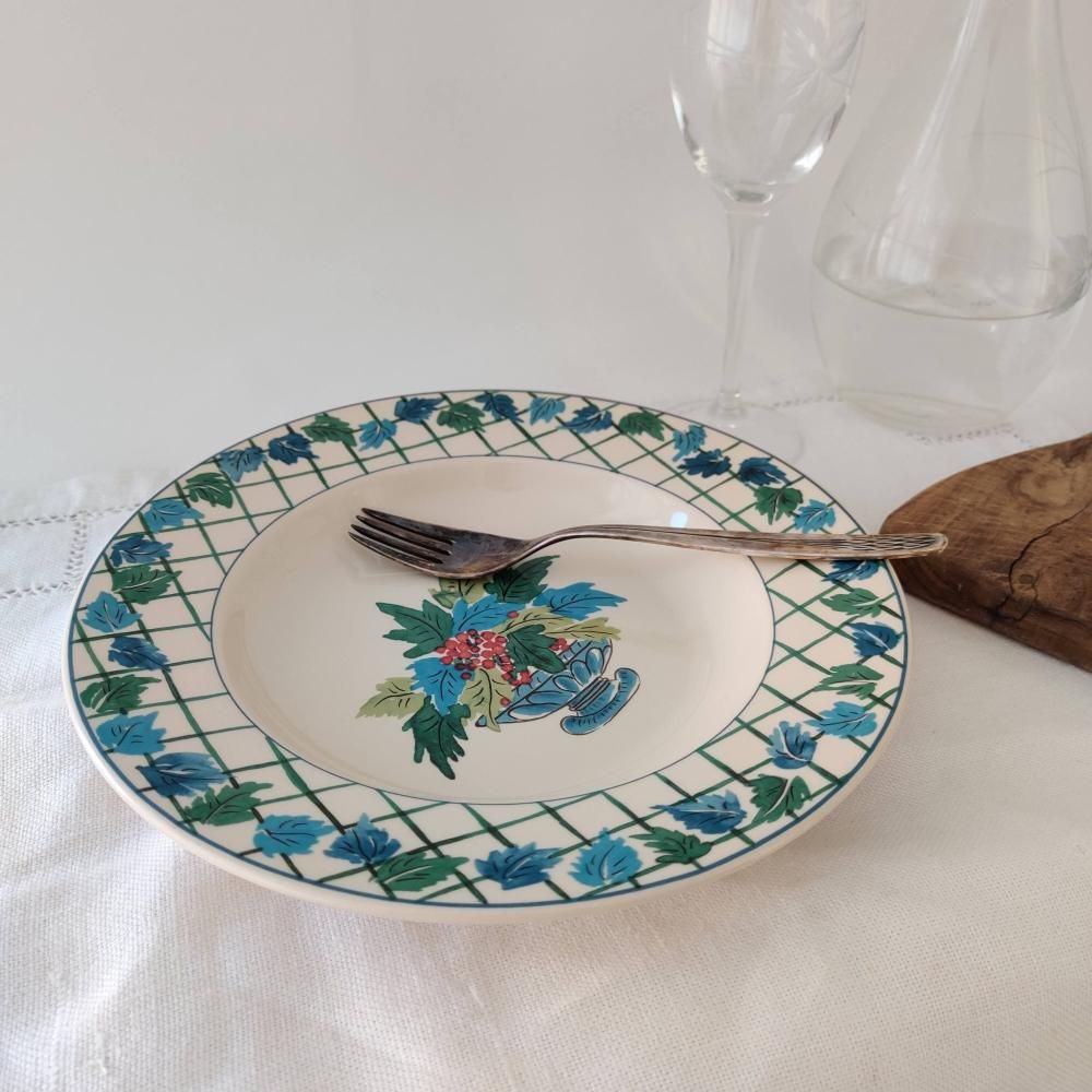 ヴィンテージ 陶器 プレート 青緑 葡萄フランス ヨーロッパ アンティーク ブロカント 食器 皿 vintage。