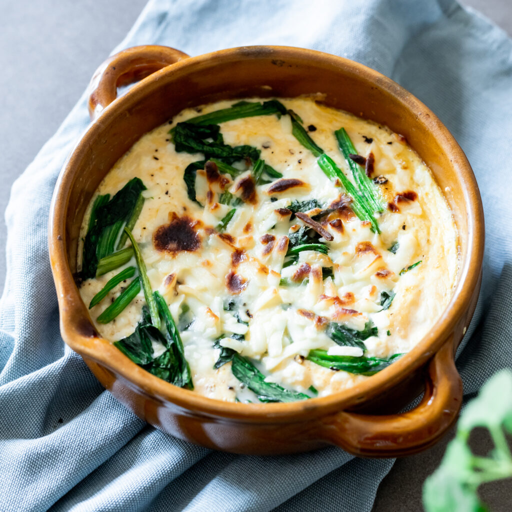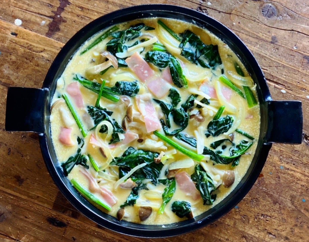 パイ生地無し!ほうれん草のキッシュの作り方炒めて混ぜて焼くだけで簡単美味しい♪クリスマスメニューの一品にもいかがでしょうか。