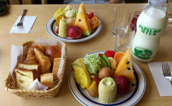 夏~初秋の朝食。フルーツ沢山にもぎたてピュアホワイト フルーツコーン 、濃厚なパパラギ牛乳、パンには自家製ジャム・あん付で大満足。前夜に食べ過ぎてもこれなら入ります。- Photo de Funbe HOF Ookuma, Ikeda-cho - Tripadvisor。