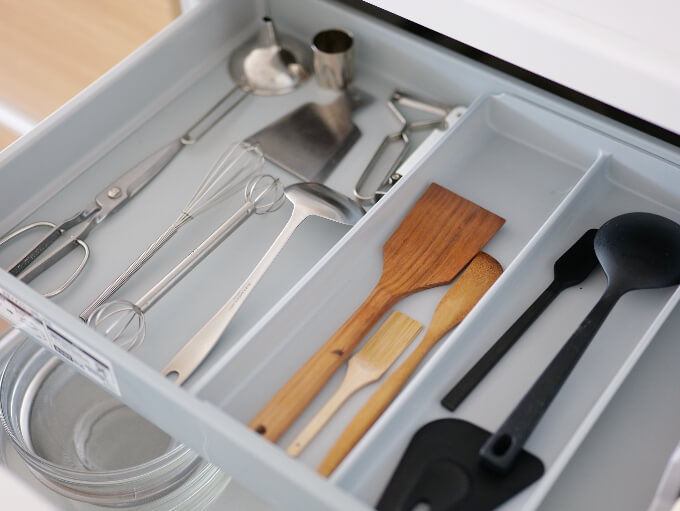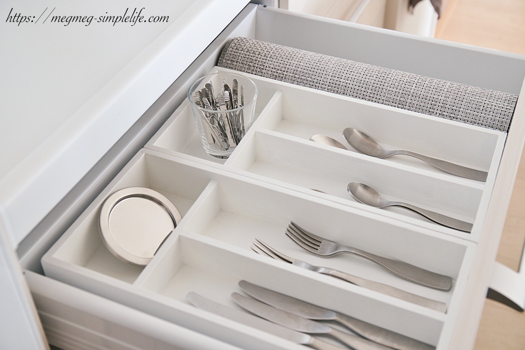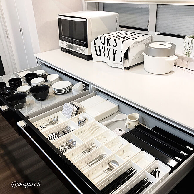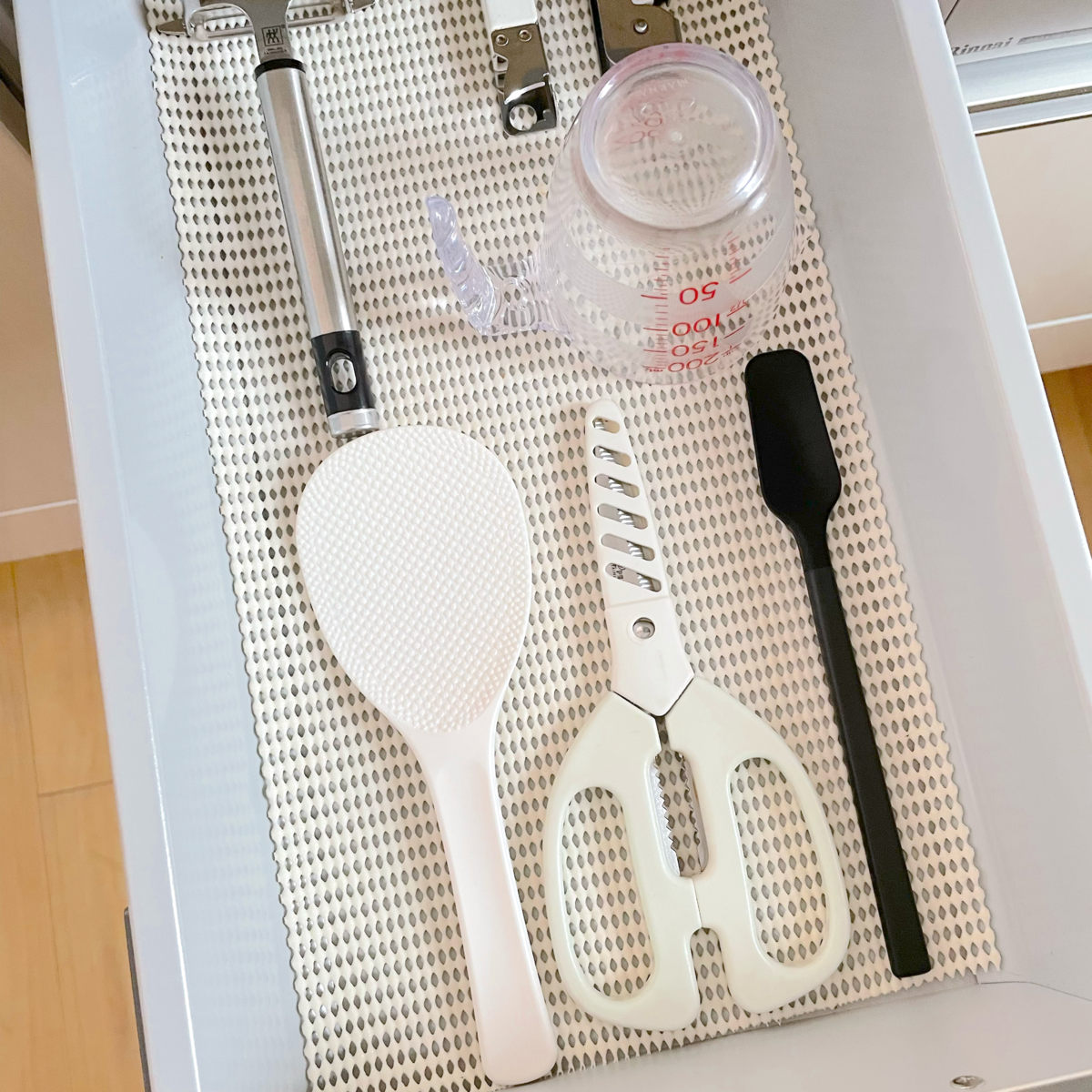 愛しのキッチングッズたちを引き出しに並べる これが一番使いやすいんだよな🤔 収納ケースのカチャカチャする音もなくなって最高✌🏻収納グッズを買い込む片付けしてませんか?🤣 9 18のVoicyでも話してまーす🍦 滑り止めシートやカトラリー、調理器具は楽天roomに。