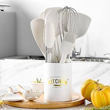 Amazonキッチン用品セット 12点 ノンスティックシリコンキッチン調理器具 北欧ミニマリストノンスティックキッチン用品人間工学に基づいたハンドルと収納バケツ付き 家庭用シェフに最適KJAOYU包丁立て。