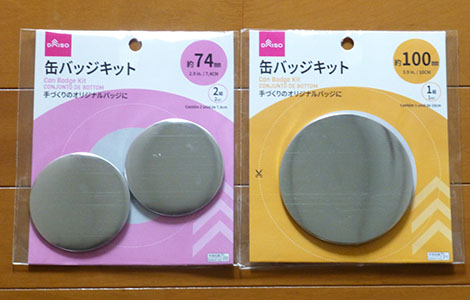 100均のダイソーで見つけた缶バッジキット。 74mmの2個セットと100mmの1個入り。 表のパーツと安全ピンの付いた裏のパーツが入っています。基本、以前ご紹介したセリアの缶バッジキットと同じものです。