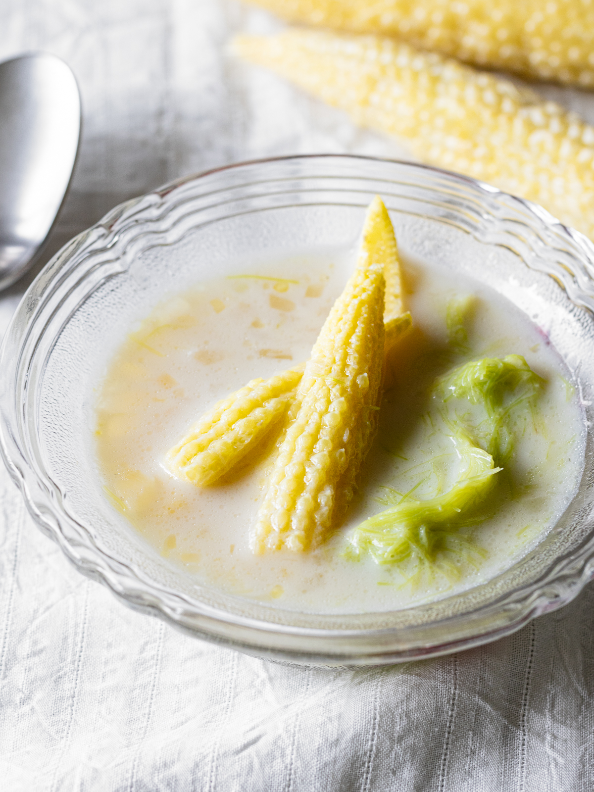 ひげ根も使ってシャキシャキ!まるごとヤングコーンの冷製スープ。