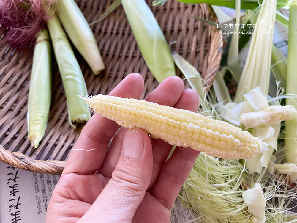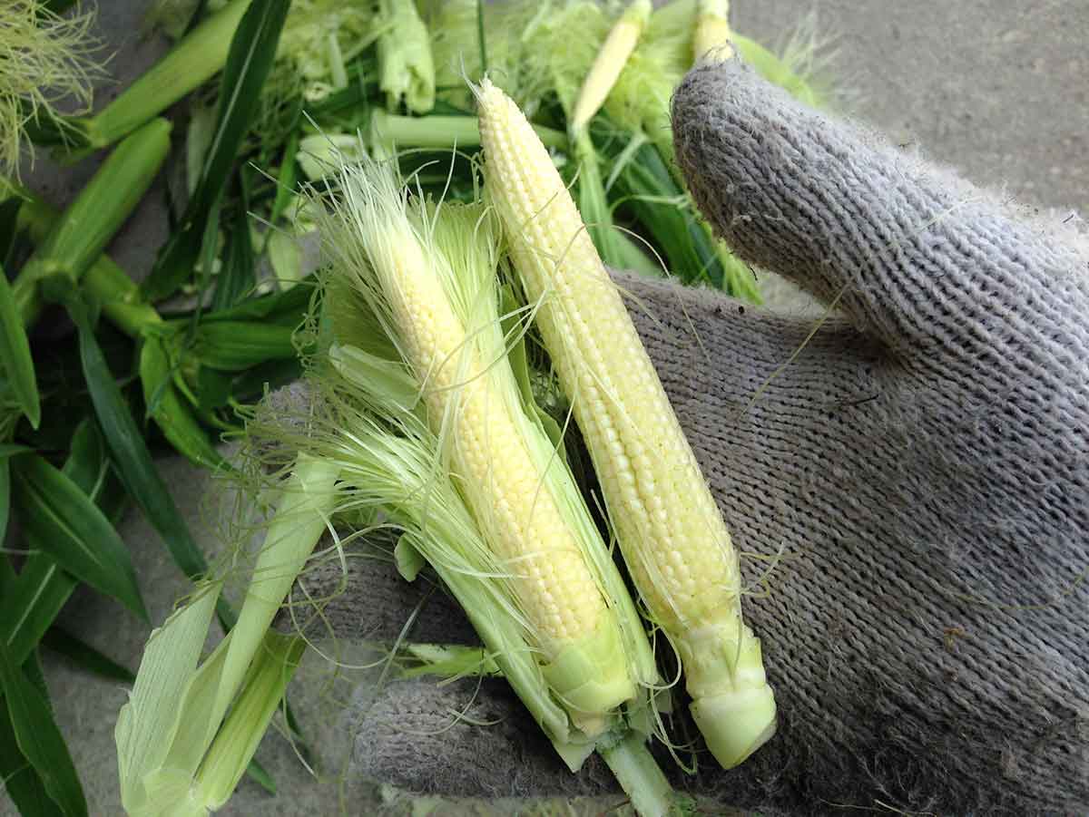 摘果したトウモロコシ、ヤングコーン ベビーコーン を食すやまむファーム。
