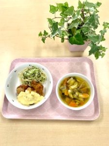 本日の給食は、郷土料理シリーズの宮崎県でした😊 おやつも宮崎ではかんしょと呼ぶさつま芋を使った「ねりくり」です😋本来はついたおもちと蒸したお芋で練ってついて作られますが、保育園でつくりやすく、食べやすいように上新粉とさつま芋で蒸しあげました✨✨✨昼食は。