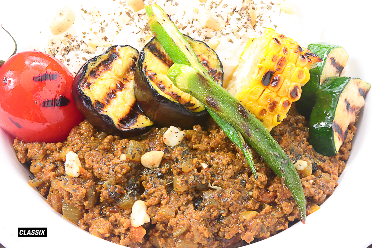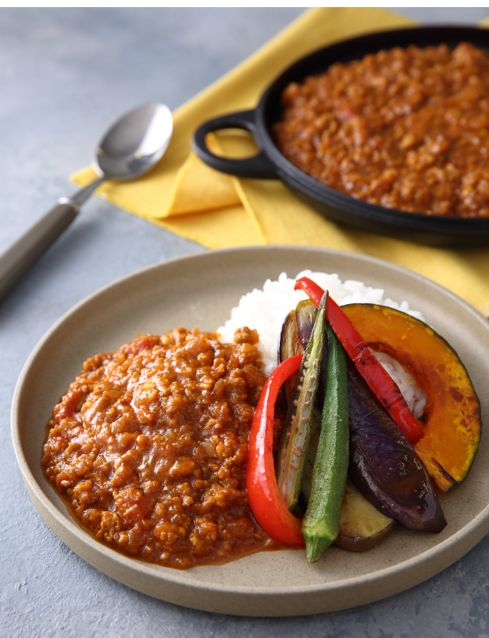 グリルした夏野菜をのせた、軽やかで香り豊かなキーマカレー焼き野菜のせスパイスキーマカレーCamp Goods Online。
