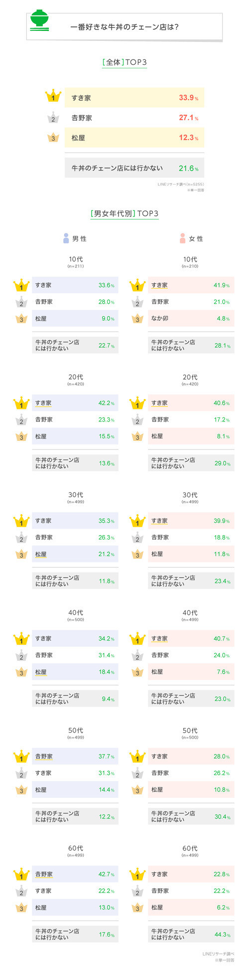 LINEリサーチ 2025年版・好きな牛丼チェーンランキング発表! 1位はどこ? 世代別の人気傾向とは?マイナビニュース。