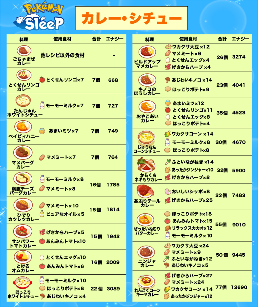 だいふく on X: "ポケモンスリープの 料理・使用食材・エナジー を一覧表にまとめました! ①全料理の一覧表 ②カレー・シチューの一覧表③サラダの一覧表 ④ドリンク・デザートの一覧表 の4枚作成したので、用途に合わせてご使用ください!レシピサイトに飛ぶのが面倒。