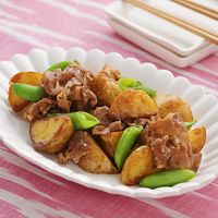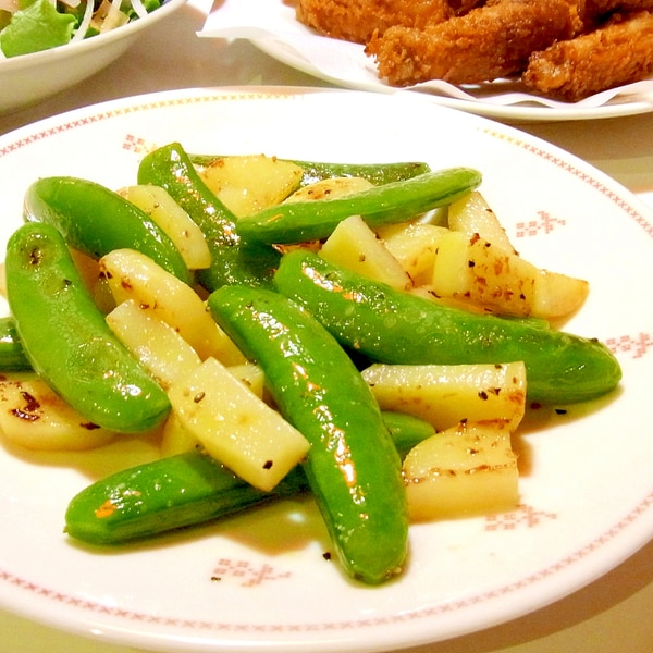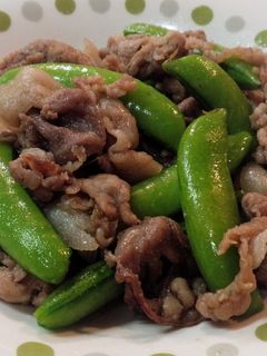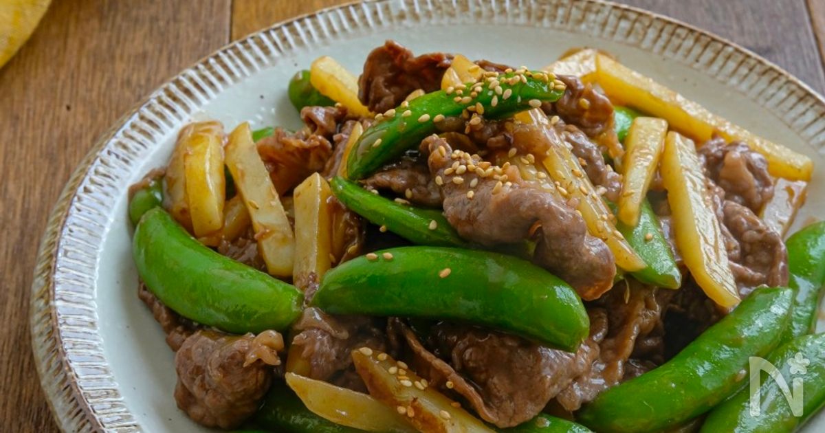 スナップえんどうとじゃがいもと牛こまのオイスター炒め。