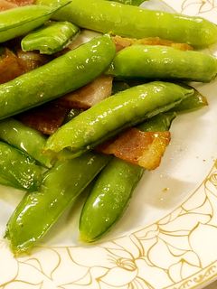 スナップエンドウと豚バラのオイケチャにんにく味噌マヨ炒め。