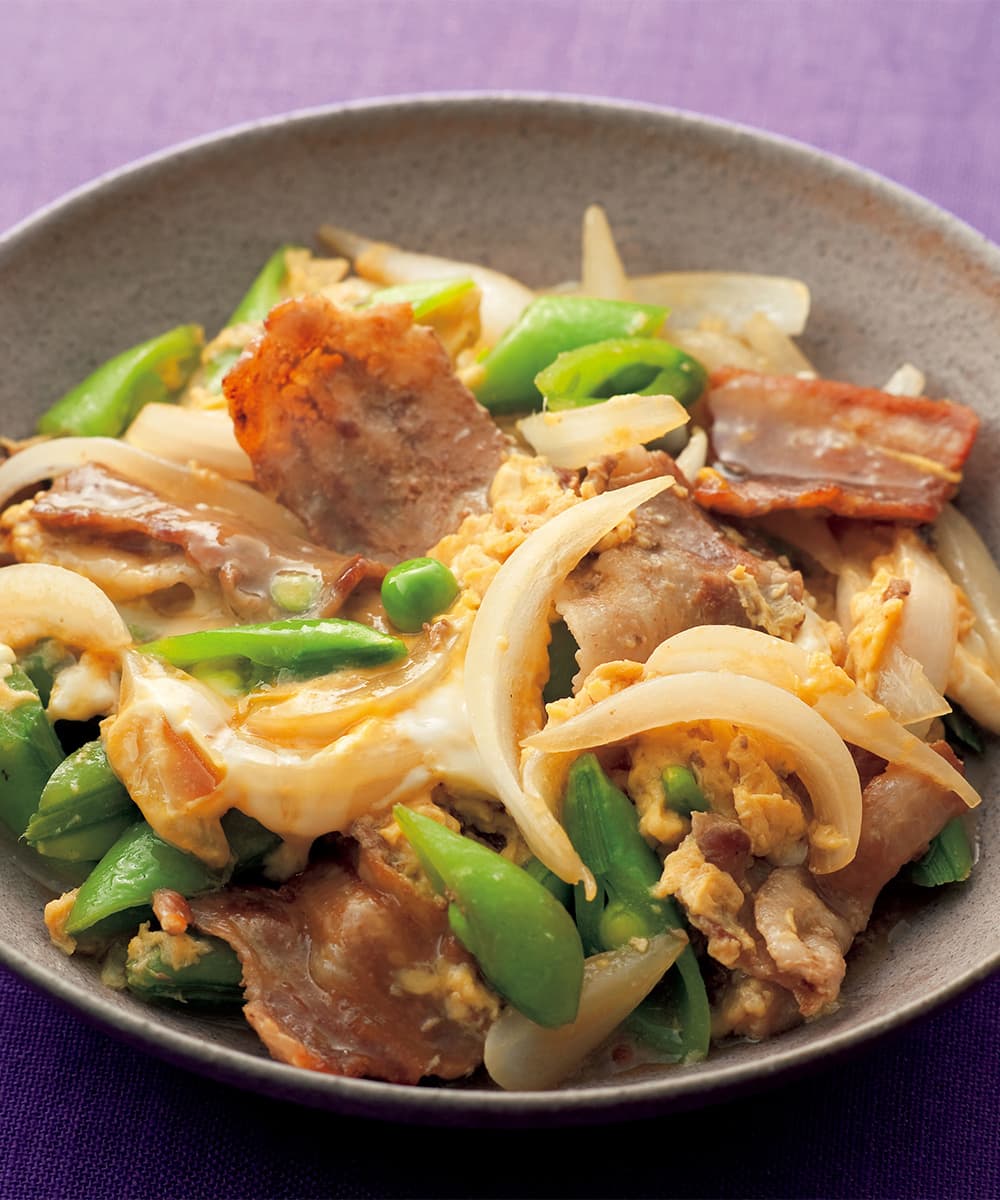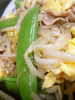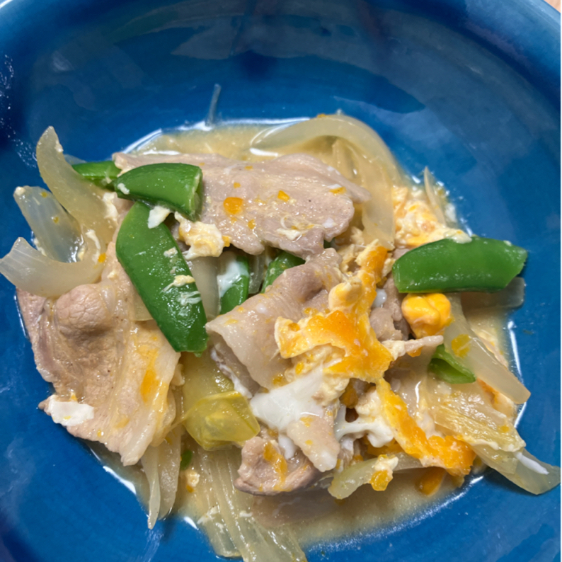 豚バラ肉とスナップえんどうの中華炒め”たまご入り♡”。