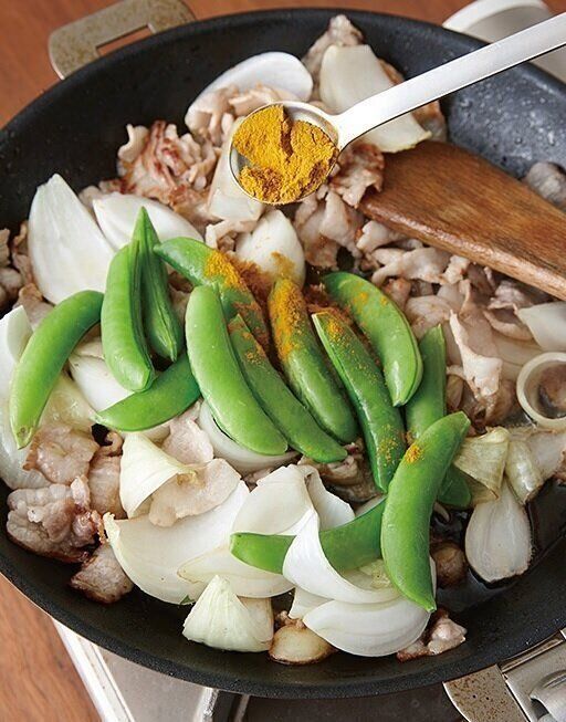 ふたをしてさっと蒸し焼き!豚バラ肉とスナップえんどうのカレー炒めサンキュ。