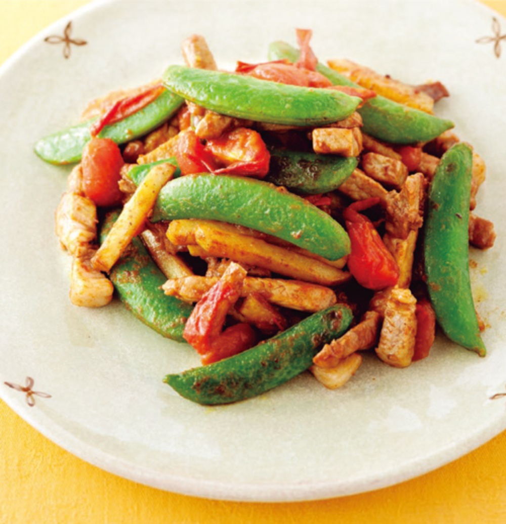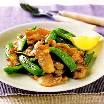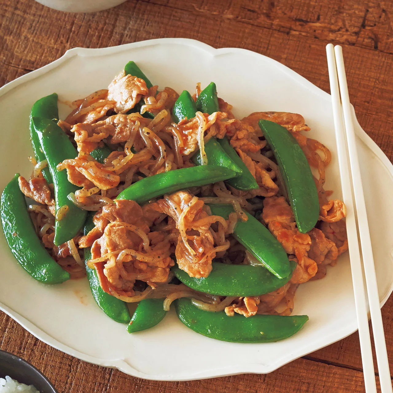 豚バラ肉とスナップえんどう、ナスのコチュジャン炒め。