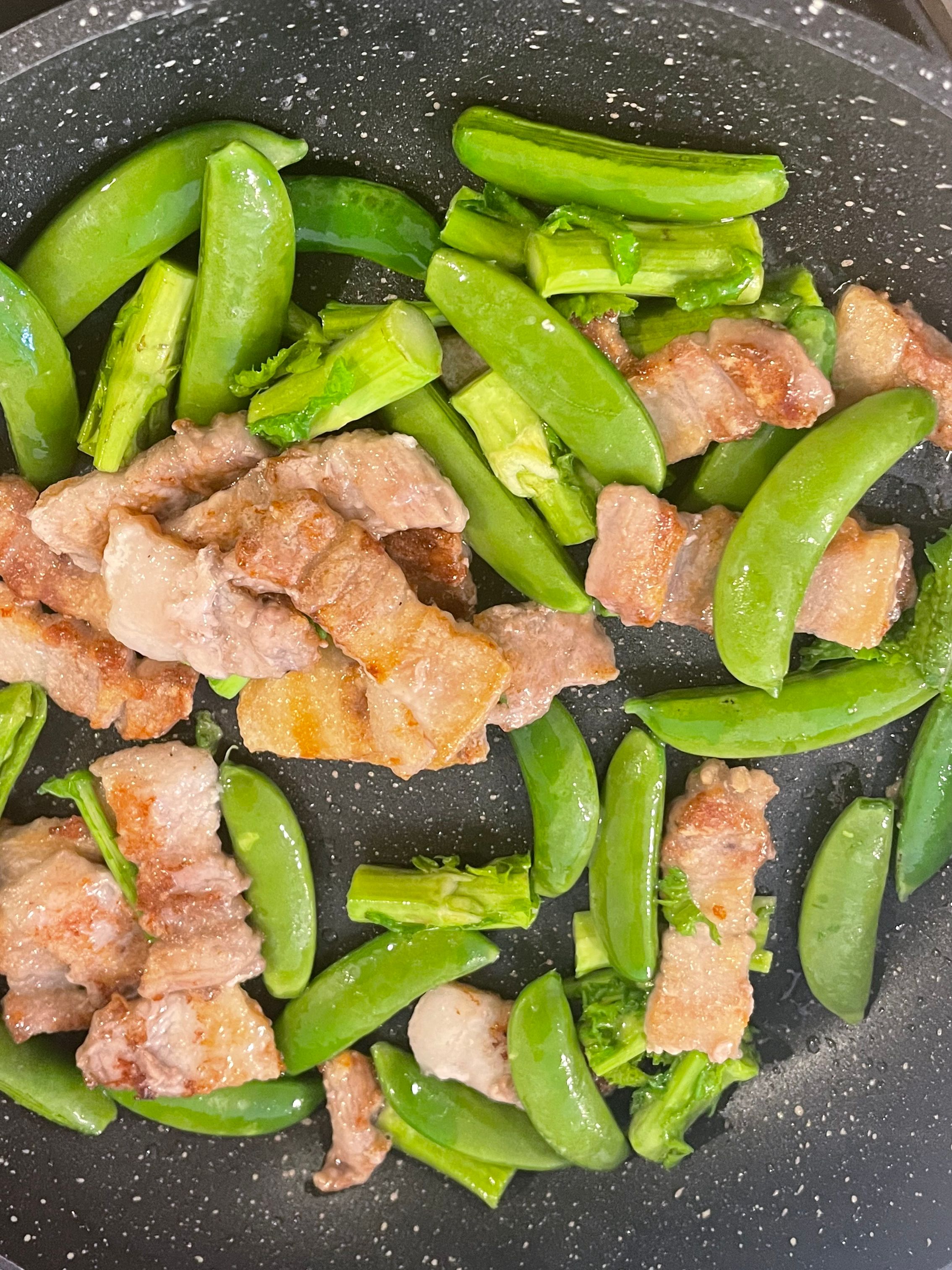 カリカリ豚ばらとスナップえんどうのガーリック旨塩炒め♡。