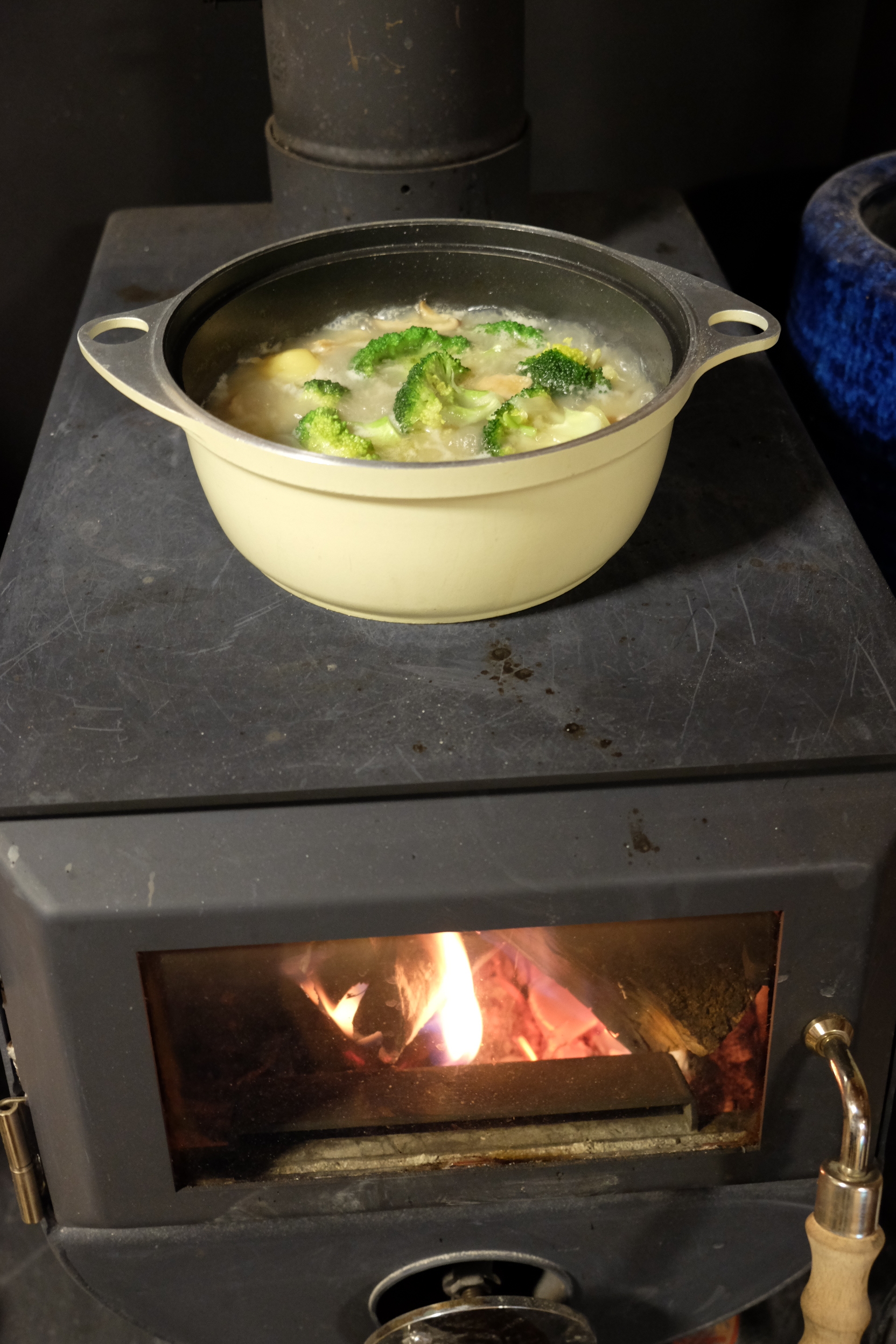 田舎暮らし ストーブの上には鍋、やかんミニピザシラス。