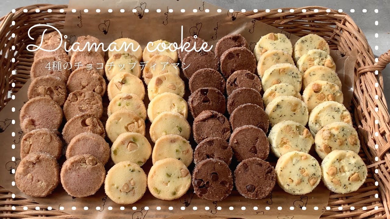 卵1個で大量生産! 4種のチョコチップディアマンクッキーの作り方 一つの生地から4種類 アイスボックスクッキー お菓子作り。