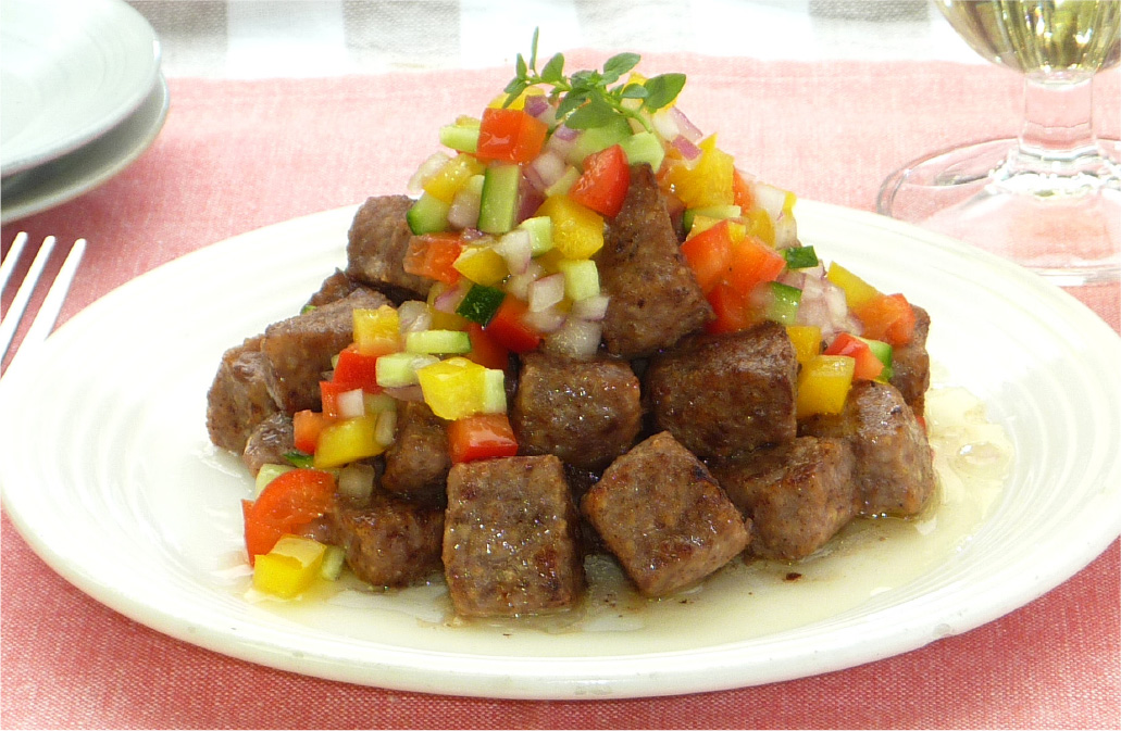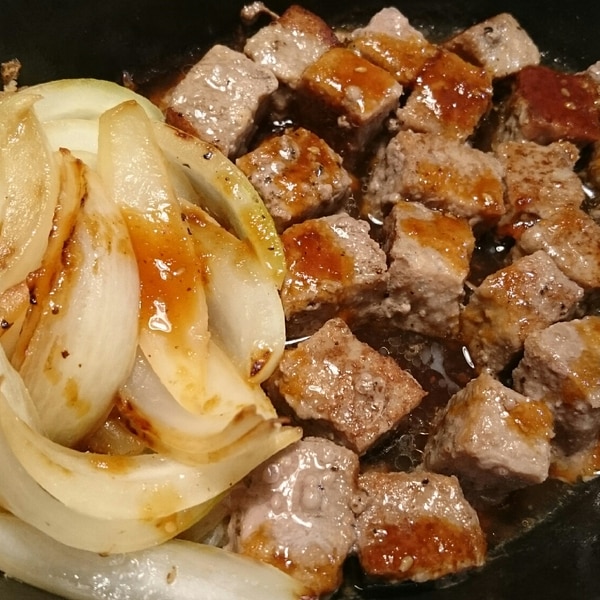 成型肉でもおいしくできる、牛のサイコロステーキ♪。
