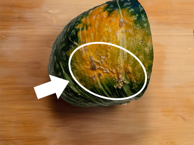 かぼちゃの皮の内側に白い固形物がある野菜商品Q&Aコープこうべ 商品検査センタ。