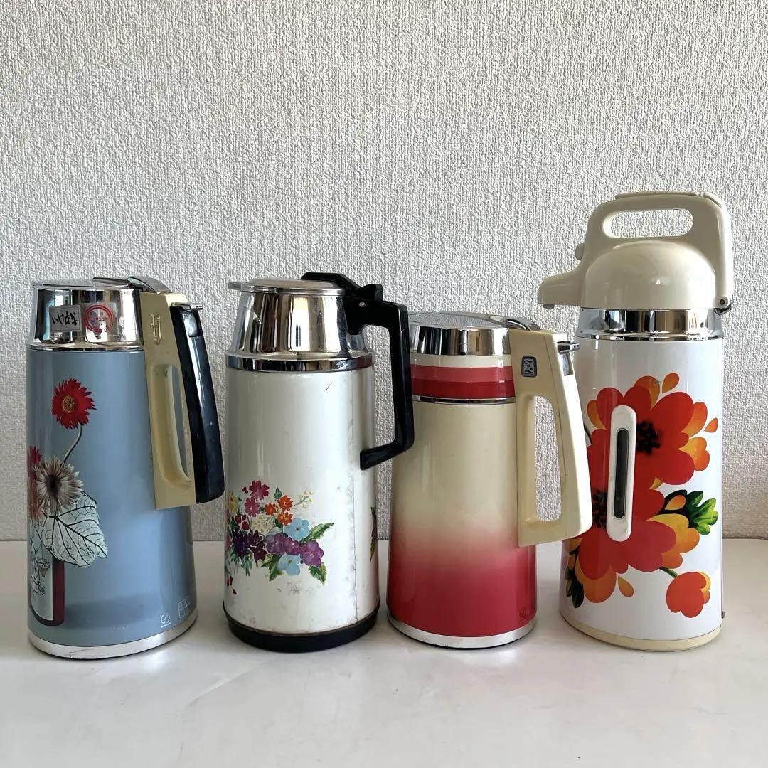 SALE カラフル花柄 魔法瓶ポット 昭和レトロ 4個セット キッチン雑貨 レトロ インテリア キッチン。