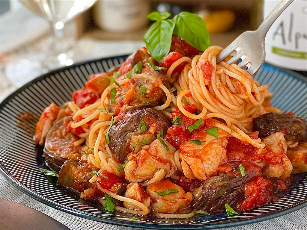レシピ 茄子と鶏肉のガーリックトマトパスタ - しにゃごはん blog。
