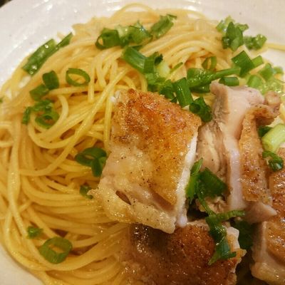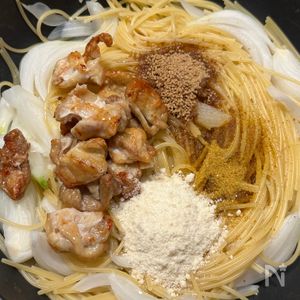 鶏皮と新玉ねぎのガーリックチーズパスタ ワンパン 10分。