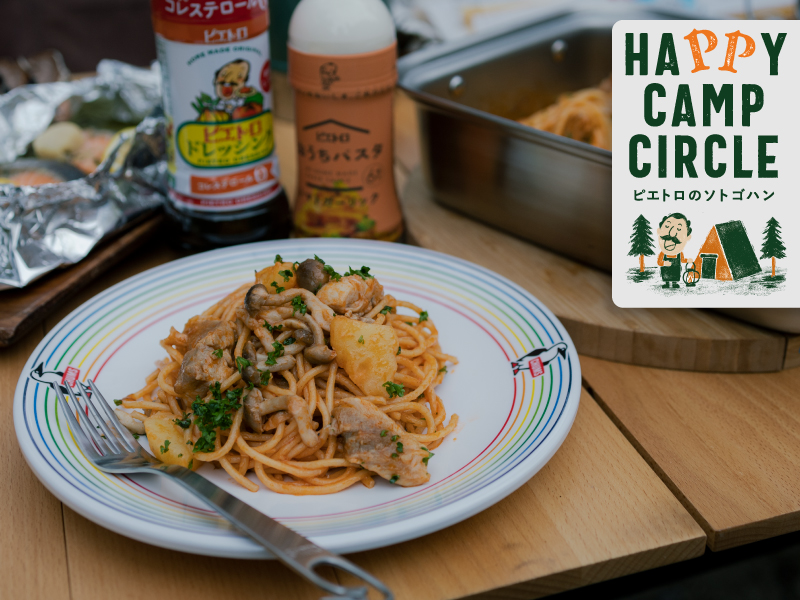 HAPPY CAMP CIRCLE 考案レシピ ワンパンで作るチキンときのこのトマトガーリックスパゲティレシピピエトロ -美味しいドレッシングとパスタを。