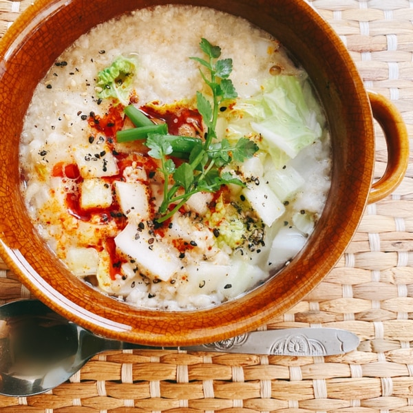 朝ごはんやひとりランチにレンジで簡単!豚ひき肉とセロリのヘルシーオートミール粥のレシピmichill byGMO ミチル。