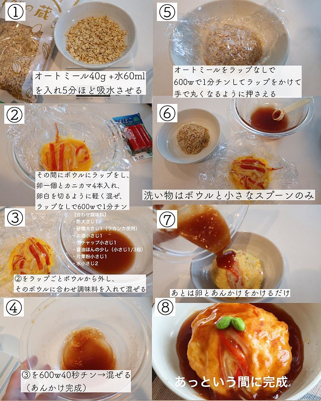 電子レンジで簡単 ワンボウルで出来るオートミール天津飯クラシル。