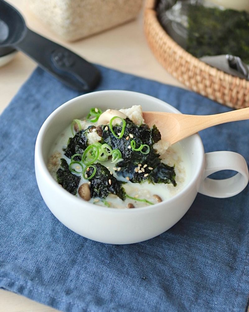 おこめのオートミールレシピ ,材料 , 約246kcal オートミール15gの場合 , ●オートミール クイック15〜30g,●無調整豆乳 150cc, ●めんつゆ 3倍濃縮小さじ1, ●ピザ用チーズ 20g, ○明太子 小さじ1, ○柚子胡椒チューブ 1cm,○刻みのり ひとつまみ,作り方 , 01.耐熱マグカップに●を入れてレンジ 600w で, 2分半加熱する,。