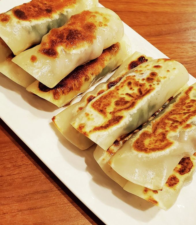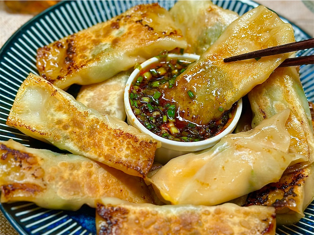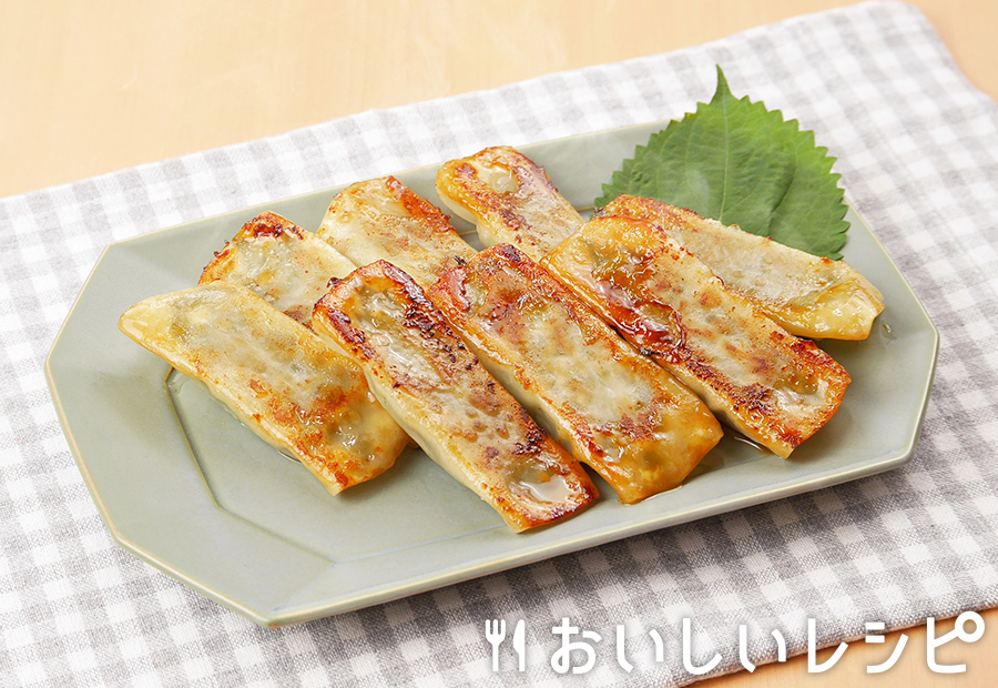 とろ~りチーズがおいしい!「豚バラと大葉のぐるぐる焼き餃子」。