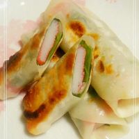 餃子の皮でカリッ♪ 魚肉ソーセージと大葉のマスタードマヨ巻き。